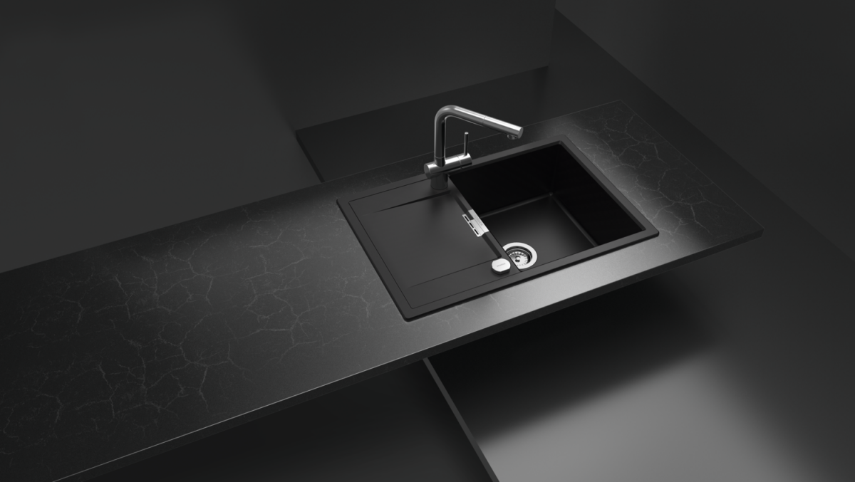 Das preisgekrönte Design der CRISTADUR®-Spüle Mono D-100 von SCHOCK wird durch den zusätzlichen, abgesenkten Ablauf und die kompakte Form ergänzt.