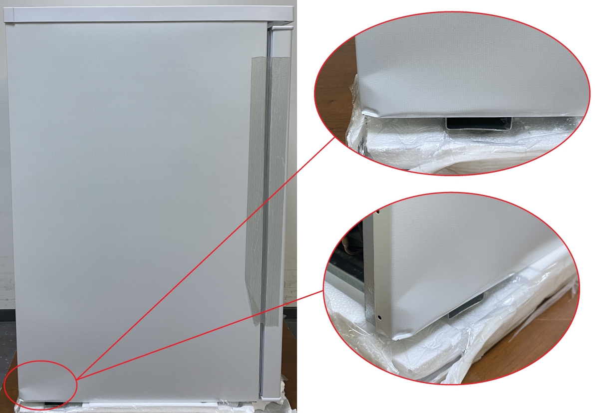 linke Seitenwand: - Delle an der linken unteren Ecke